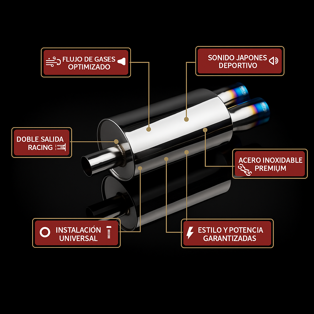 Con entrada de 2" y doble salida de 3", y un largo total de 30 cm (alto 19 cm, ancho 14 cm), este sistema dual outlet distribuye el flujo de forma eficiente, mejorando la respuesta del motor y aportando un look racing profesional. Construido en acero inoxidable de alta resistencia, ofrece durabilidad, rendimiento constante y un acabado premium ideal para proyectos JDM.